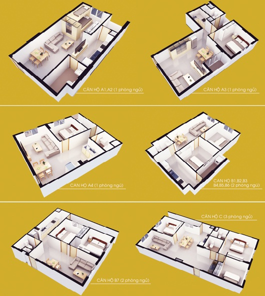 Tầng 2 đến tầng 14 là 259 căn hộ gồm có diện tích từ 49,5 - 109m2 với từ 1 - 3 phòng ngủ.