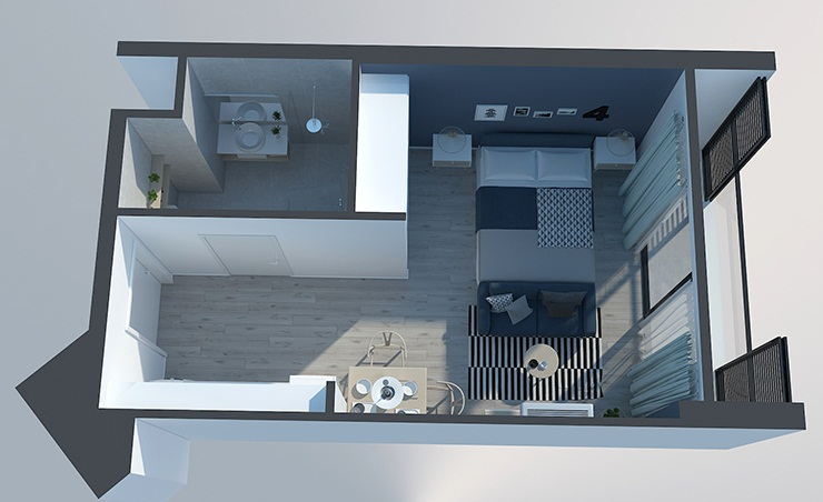 Căn hộ A có diện tích là 46,5m2. Căn hộ với thiết kế hiện đại, hợp lý tạo nên không gian rộng. Toàn bộ khung màu đều mang đặc trưng gam màu lạnh, mang lại cảm giác mát mẻ, thoải mái nhưng không mất đi sự sang trọng.
