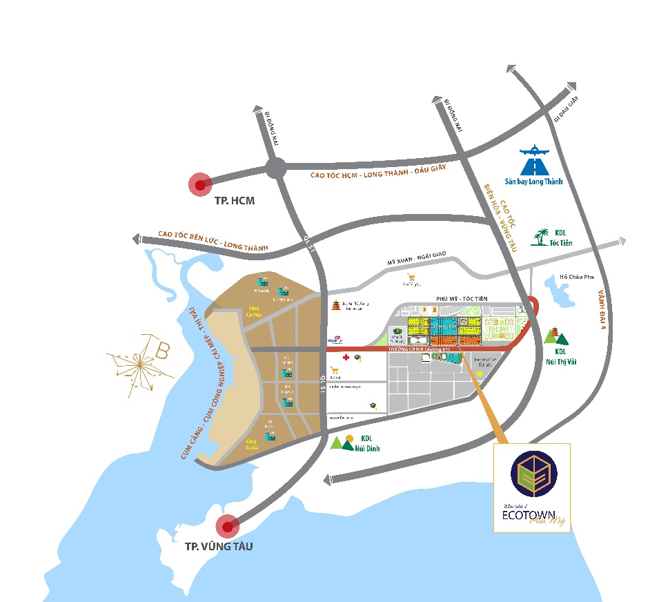 Khu nhà ở Ecotown Phú Mỹ được kỳ vọng trở thành “Phố thương gia giữa lòng đô thị cảng”. Với vị trí giao thương chiến lược khi nằm trên 3 trục đường Trường Chinh, Phú Mỹ - Tóc Tiên và cao tốc Biên Hòa – Vũng Tàu.