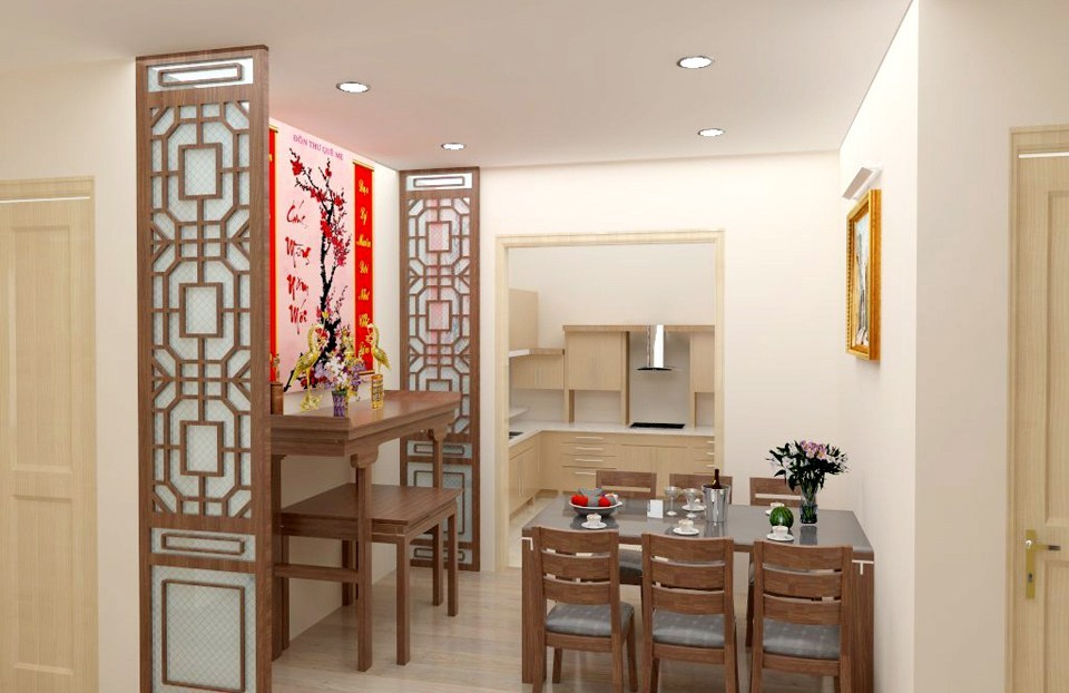 Bàn thờ với thiết kế vách ngăn có hoa văn truyền thống, được đặt ở phía trước bàn ăn với mong muốn sum vầy với ông bà tổ tiên.