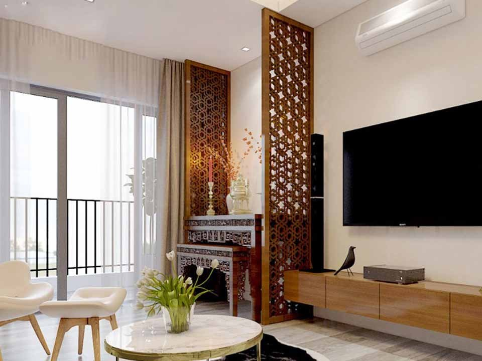 Thiết kế hoa văn cầu kì của vách ngăn bàn thờ thích hợp cho những căn hộ chung cư hiện đại nhằm tăng tính thẩm mỹ.