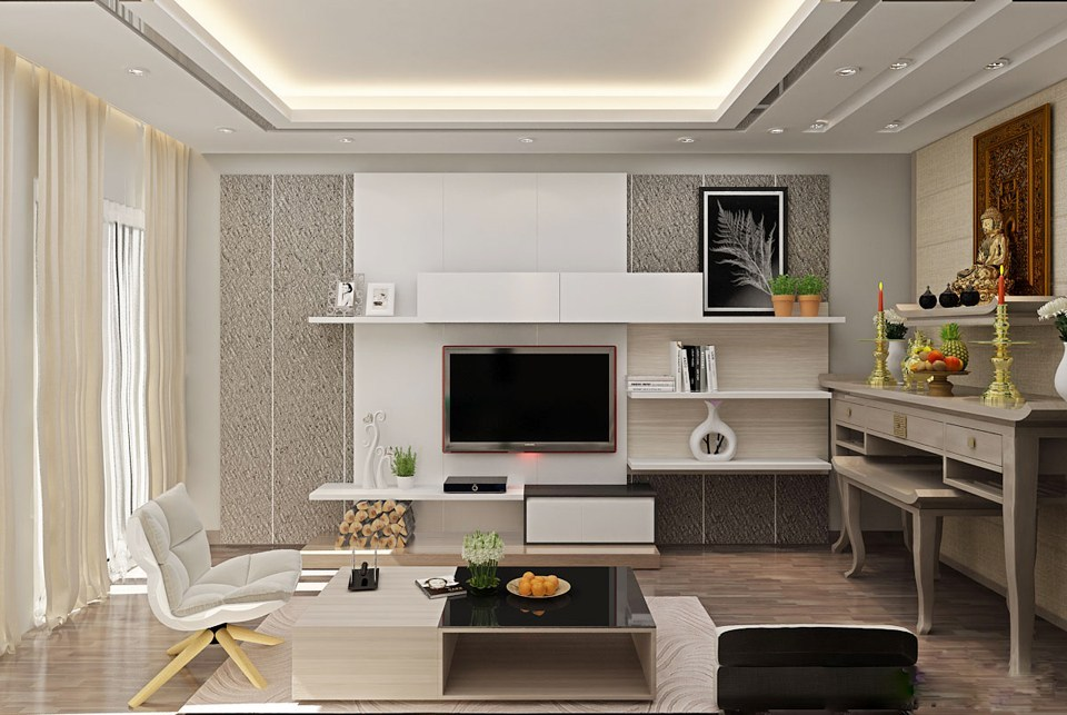 Với các thiết kế tủ, kệ tivi hiện đại tích hợp các chức năng như ngày nay, gia chủ không cần phải thiết kế thêm nơi đặt bàn thờ riêng.