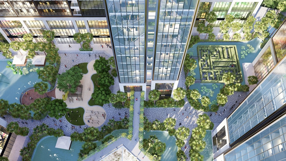 Dự án được thiết kế như resort, nằm trên một “ốc đảo”, giữa hồ nước nhân tạo có diện tích mặt nước lớn bậc nhất khu Nam 12.000 m2. Tất cả các tầng căn hộ lẻ trên các tòa tháp đều có vườn treo quy mô lớn. Trên đỉnh tòa tháp là các khu công viên nhiệt đới, đường dạo bộ trên không, hệ thống hồ bơi vô cực, vườn thiền quy mô…