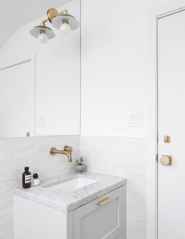 Một tấm gương lớn được đặt trong phòng tắm có tác dụng nhân đôi không gian giúp căn phòng trông rộng lớn hơn rất nhiều. Để tạo cảm giác tự nhiên, gạch màu trắng được sử dụng khắp phòng tắm.