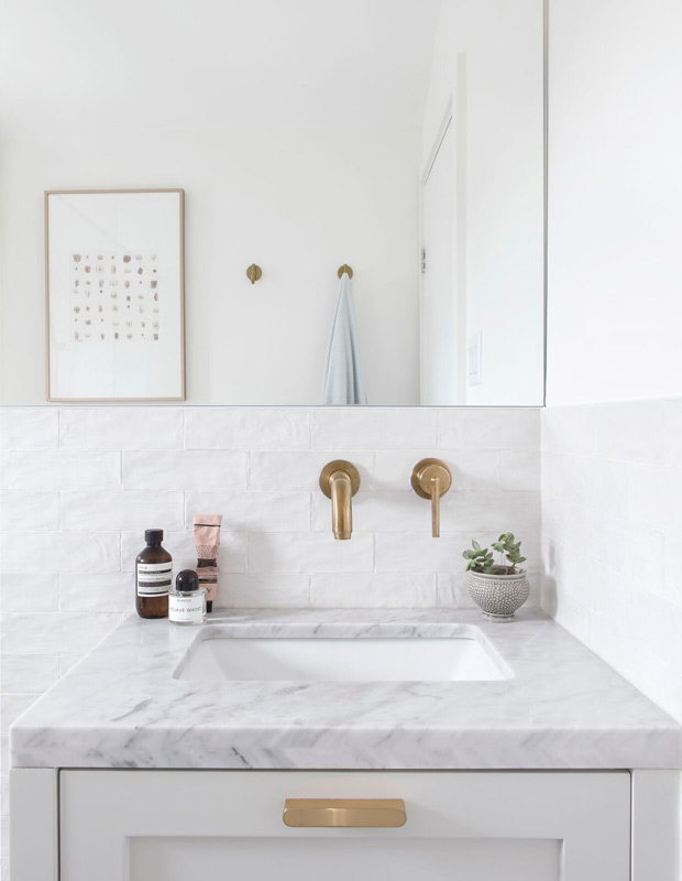 Màu trắng sáng, đá cẩm thạch mát mẻ và màu đồng cho phòng tắm một cái nhìn gắn kết, nhưng tinh tế. Để giữ cho bức tường phòng tắm không bị trống trải, có thể trang trí một khung hình với những chi tiết cá tính, nghệ thuật.