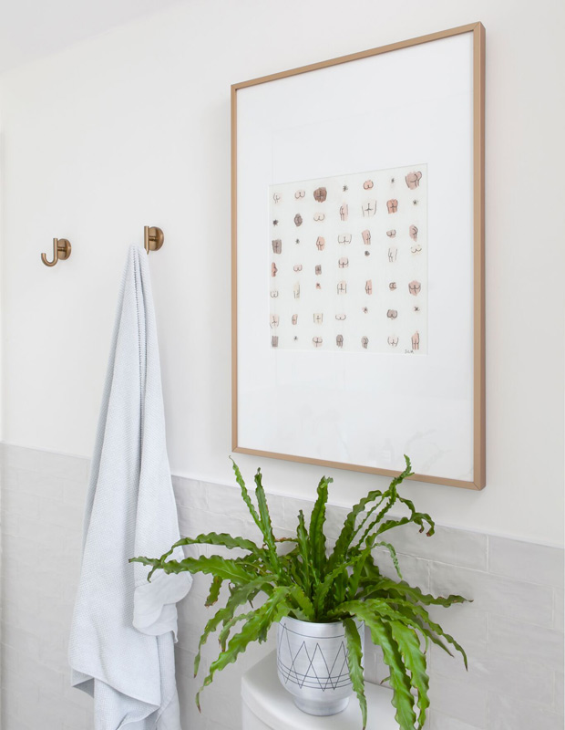 Thêm một kệ lớn trong phòng tắm cung cấp một nơi được chỉ định để lưu trữ các sản phẩm để chúng không bị lộn xộn trên sàn nhà hoặc bên trong bồn tắm. Một tác phẩm nghệ thuật đóng khung và nhiều cây xanh nhỏ được treo lên tạo điểm nhấn trang trí.