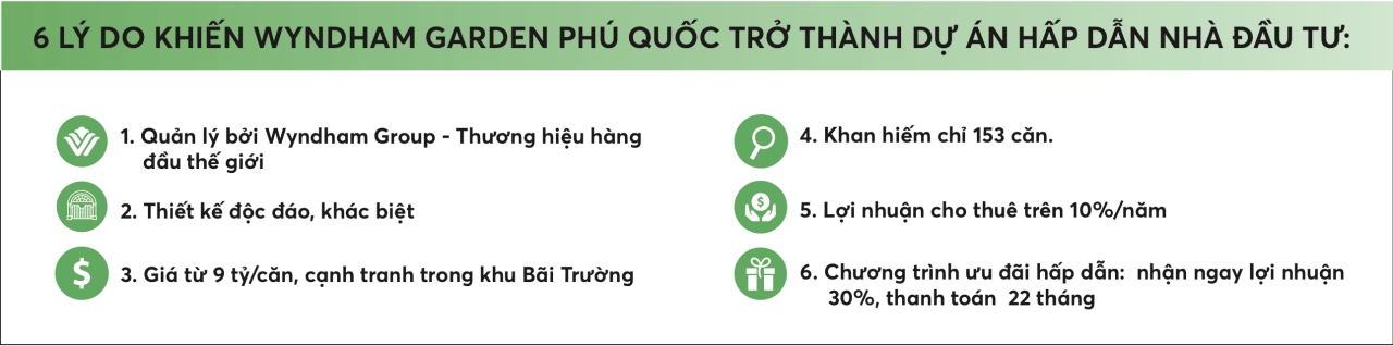 Theo tính toán từ Nam Group, nhờ lợi thế thương hiệu và có sẵn lượng khách hàng trung thành khoảng 50 triệu khách toàn cầu, một khi đưa vào vận hành, Wyndham Garden đảm bảo có công suất vận hành tối thiểu đạt 65% và có thể mang về lợi tức trên 10%/năm cho chủ nhân sau khi trừ hết các chi phí quản lý.