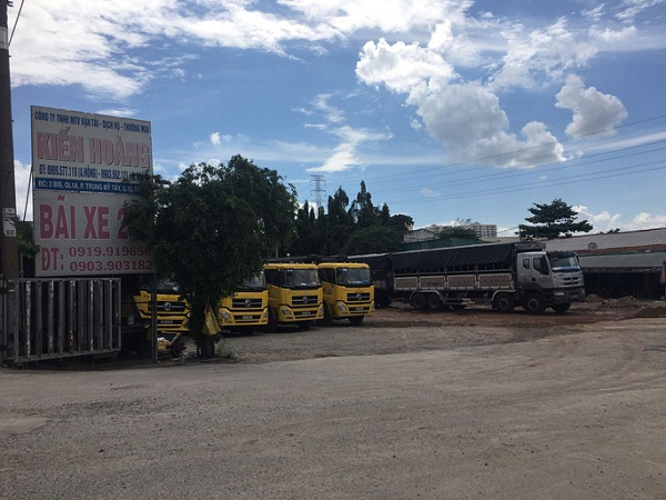 Vào bên trong khu đất làm nhà xưởng trên, chúng tôi ghi nhận có cả chục cơ sở đang hoạt động, với ngành nghề chủ yếu gia công sắt thép, gỗ… Diện tích mỗi nhà xưởng từ 400 m2 đến 1.000 m2, dựng bằng sắt khá kiên cố, tồn tại hơn 5 năm nay. Sát bên hệ thống nhà xưởng là bãi đậu xe tải của 4 doanh nghiệp và một bãi đất dùng để trưng bày đá bonsai. Bên trong bãi đỗ xe có hàng chục xe tải.