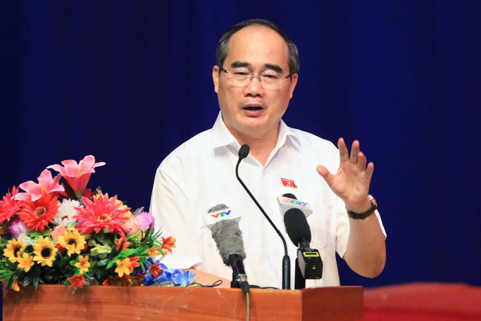 Bí thư Thành ủy TP.HCM Nguyễn Thiện Nhân trong buổi đối thoại với người dân Thủ Thiêm ngày 20/6. Ảnh: Hữu Khoa (Tuổi Trẻ).