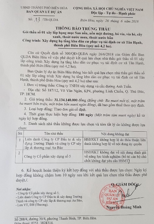 Được biết, Cty TNHH xây dựng và Cầu đường Anh Tuấn có địa chỉ số 187/12 Võ Văn Ngân, khu phố 4, phường Liên Chiểu (quận Thủ Đức, TP Hồ Chí Minh), có mã số thuế 0309256215. Tuy nhiên theo tìm hiểu được biết, trong một ngày làm việc (26/06/2018) Ban quản lý dự án (BQLDA) Biên Hòa cùng lúc đã phát hành 2 văn bản quan trọng đó là: Thông báo trúng thầu số 13/TB-BQLDA và Quyết định trúng thầu số 300/QĐ-BQLDA đều được quyền Giám đốc Nguyễn Hoàng Minh ký. Ngay sau khi các văn bản này ban hành, đã bị các nhà thầu phản bác và “tố” BQLDA thông đồng với nhà thầu trong việc làm ngơ với các gian lận của Cty TNHH xây dựng và Cầu đường Anh Tuấn.