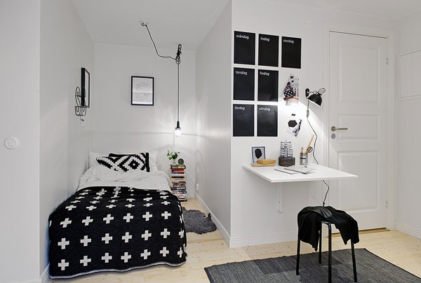 Màu trắng có thể dùng làm màu sơn tường là chủ yếu. Các món đồ nội thất như giường, bàn ngủ, kệ sách, đèn hoặc các vật dụng khác thì nên chọn màu sắc tương phản với màu trắng để tạo ấn tượng, khiến căn phòng trở nên bắt mắt hơn.