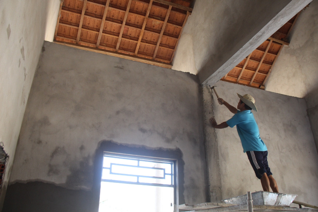 Cách ngôi nhà chị Nhân chừng 20m, ngôi nhà cấp 4 mái thái của bà Hoàng Thị Đức (58 tuổi) cũng sắp hoàn thành. Giống chị Nhân, bà Đức cũng là hộ có nhà cửa nằm trong vùng ngập lũ ven sông An Lão thuộc thôn Thuận An. Sau khi được chính quyền xét duyệt, cấp 300m2 đất, bà Đức “xắn tay” vào việc xây dựng nhà ở.