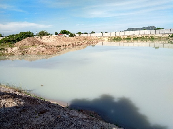 Hồ nước rất lớn bên trong mỏ cát lậu để lọc cát. Ảnh: Quế Hà