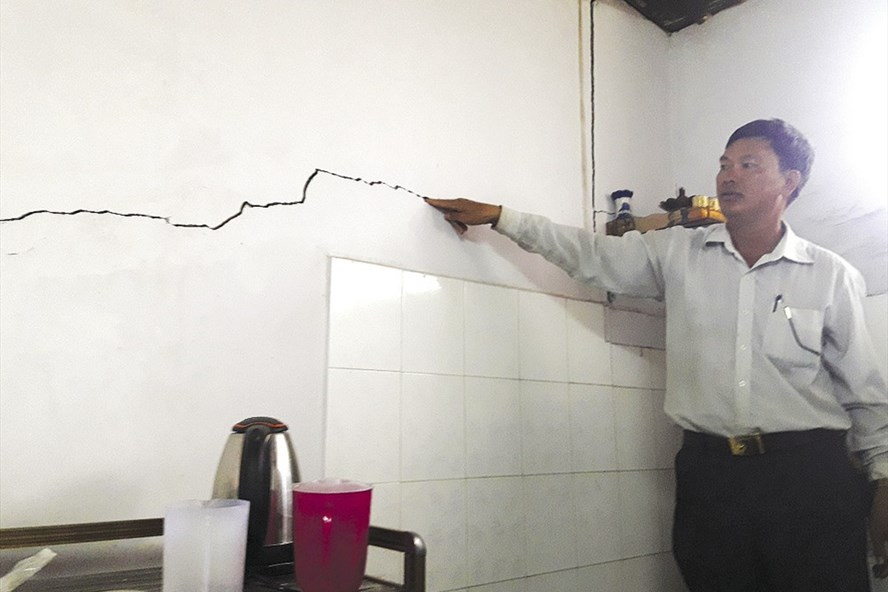 Ông Quân bức xúc với vết nứt lớn ở tường nhà. Ảnh: Trần Tuấn