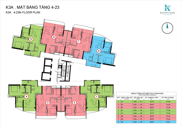 Mặt bằng tầng căn hộ 3 phòng ngủ tại Kenton Node. Mỗi tầng chỉ có 4 căn hộ, không có khái niệm “căn hộ góc” vì mỗi căn đều là căn góc, có 3 mặt thoáng, từ các căn hộ di chuyển đến thang thoát hiểm không quá 4m (quy định chung là 30m). Đây được xem là ưu điểm vượt trội về an toàn PCCC của dự án.
