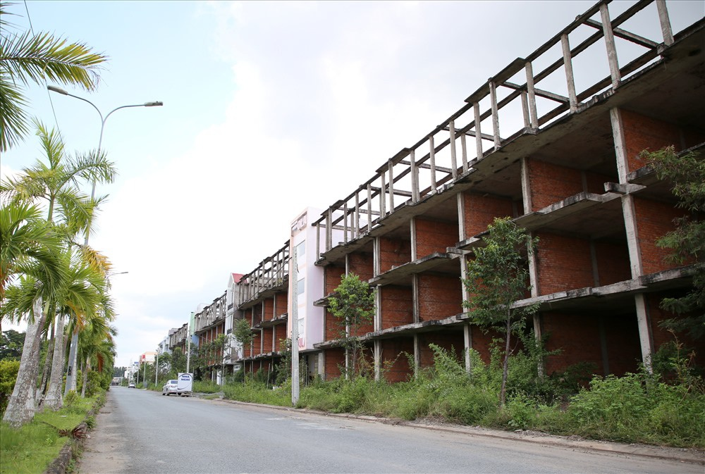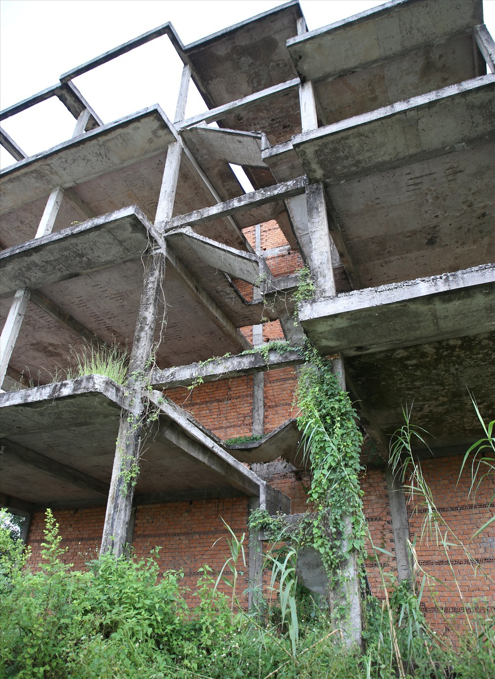 Chủ đầu tư khu dân cư chỉ mới xây dựng được phần thô, rồi để vậy phơi sương phơi nắng. Ảnh: H.Thơ.