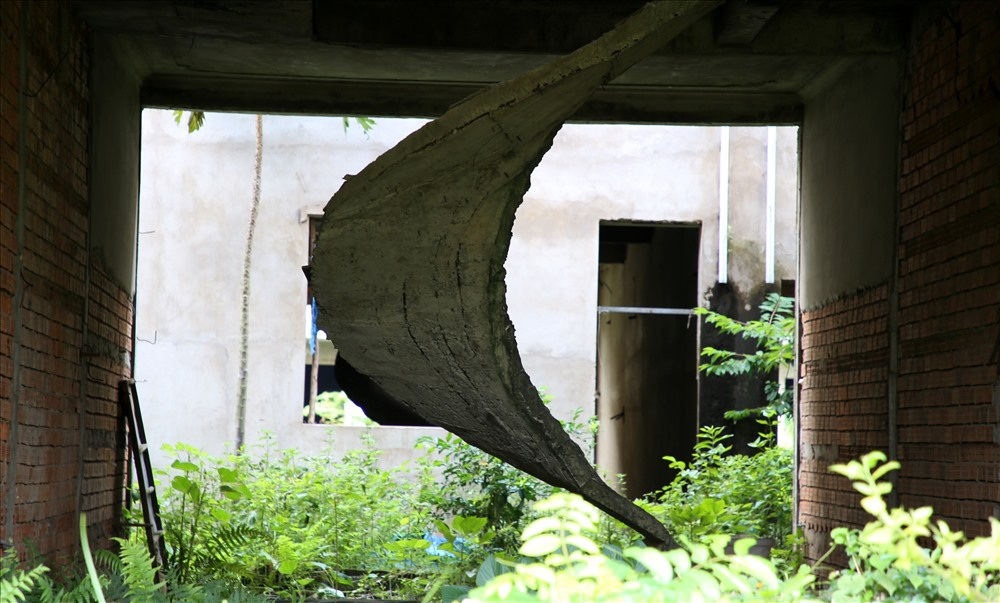 Xây thô, dầm mưa nắng nên tường gạch bắt đầu xuống cấp. Ảnh: H.Thơ.