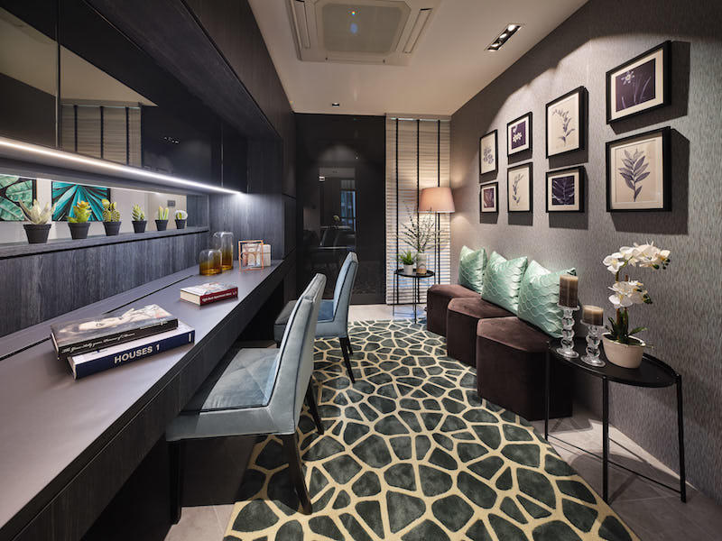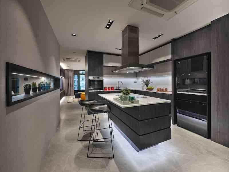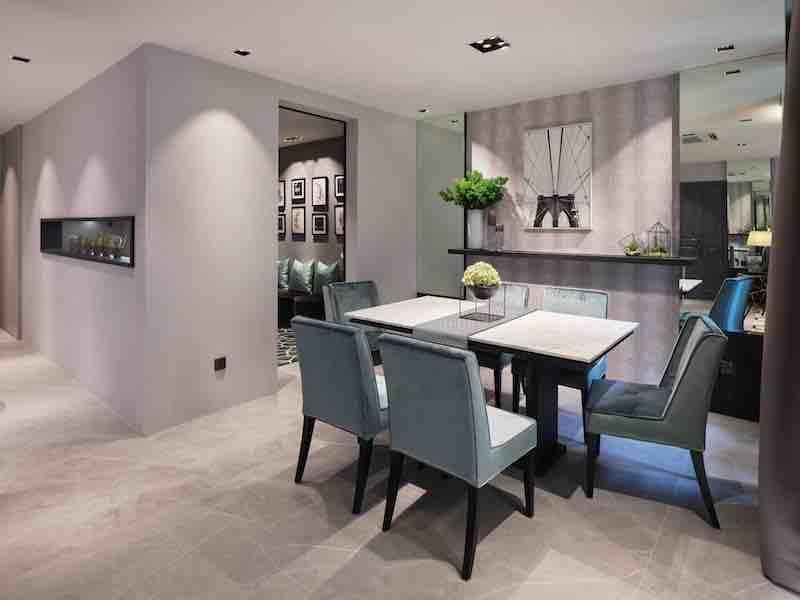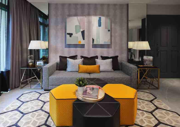 Căn hộ được sử dụng một bảng màu trung tính gồm các màu xám đậm, trắng, be, cũng như các màu nhấn như mù tạt và xanh lá cây để tạo cho không gian sự rung cảm trẻ trung.