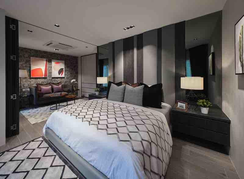 Một tấm thảm có hoa văn bắt mắt làm điểm nhấn ngay lập tức khi bạn bước vào không gian. Gia chủ đã phá vỡ bức tường giữa phòng ngủ chính và phòng ngủ liền kề để tạo ra một bộ tổng thể lớn hơn, có khu vực phòng khách riêng. Thay cho bức tường, một cánh cửa gấp được lắp đặt để khi cần thiết có thể thêm một phòng cho trẻ em.