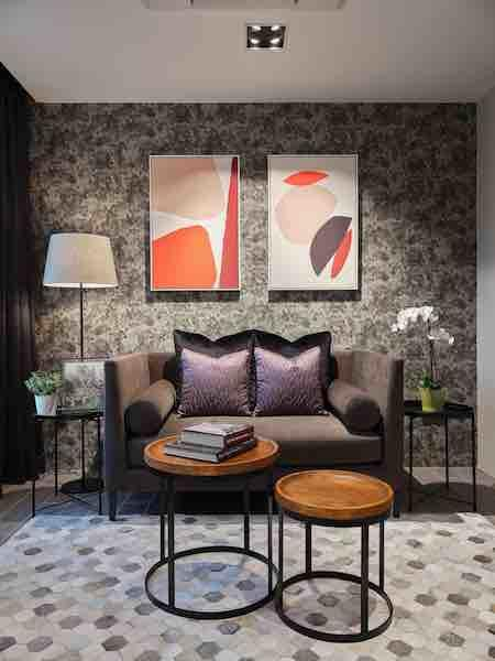 Một hình nền hoa văn màu xám giúp thêm một hiệu ứng kết cấu cho bức tường trong phòng khách của phòng ngủ chính. Các tác phẩm nghệ thuật trong màu sắc tươi sáng giúp thêm màu sắc.