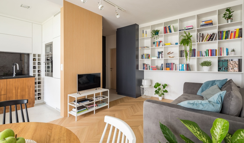 Alomuabannhadat - Căn hộ chưa đầy 50m2 này được thiết kế cho hai người với tông màu trắng, xen lẫn chút xám và đen tạo không gian tươi mới.