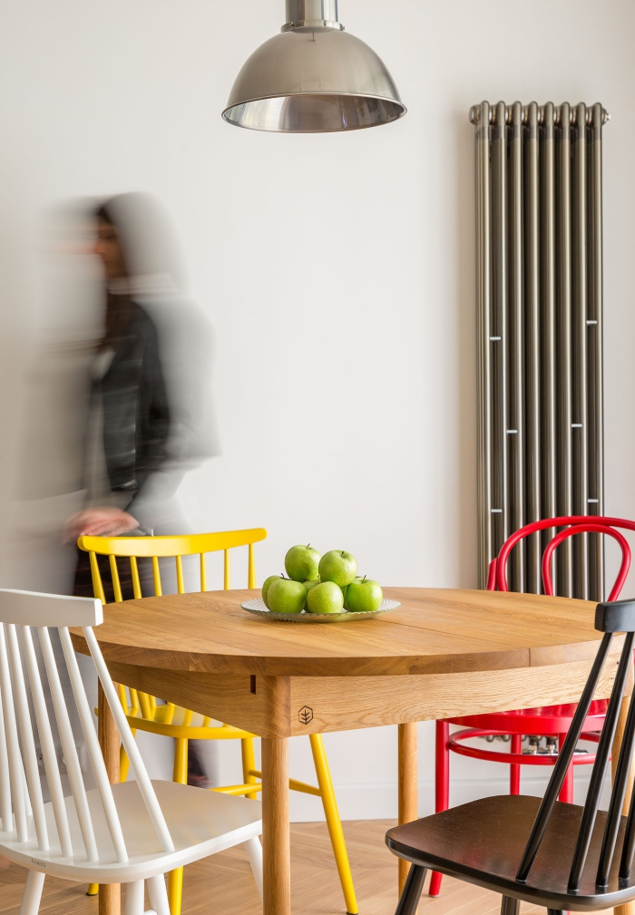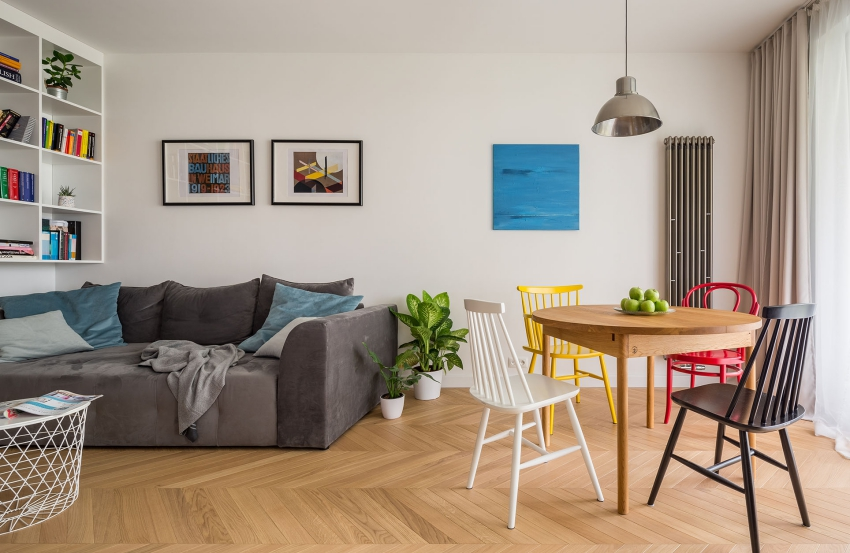 Một bàn ăn nhỏ được bố trí ngay trong phòng khách với điểm nhấn là ghế ngồi nhiều màu sắc.