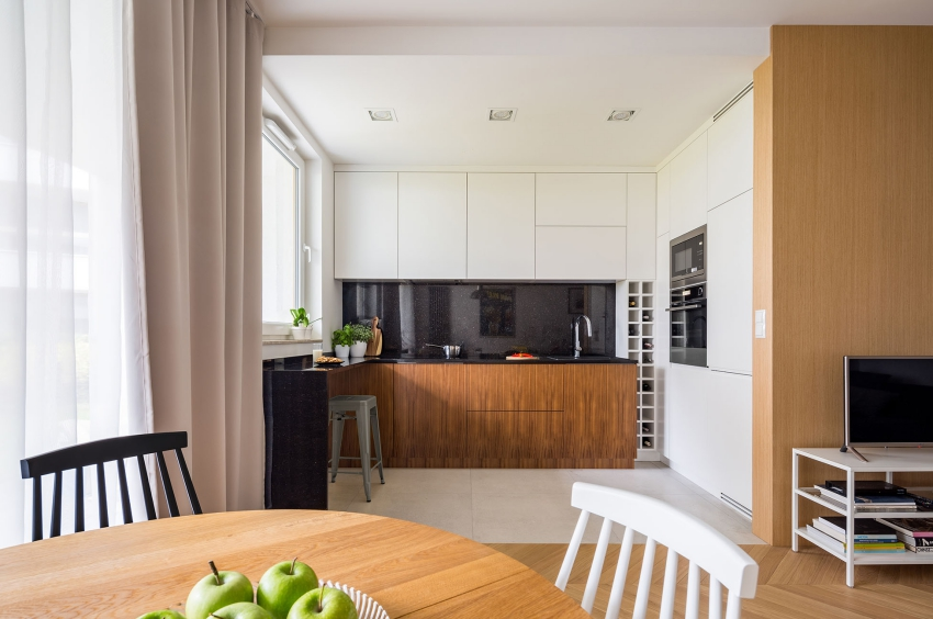 Khu vực phòng bếp kế bên được phòng khách dễ dàng phân biệt với sàn gạch trắng. Nội thất phòng bếp khá tiện nghi và được sắp đặt ngăn nắp, gọn gàng với không gian lưu trữ linh hoạt.