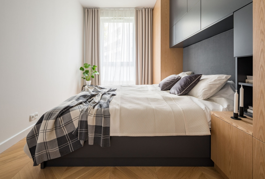 Phòng ngủ với ba tông màu cơ bản trắng đen xám, sàn gỗ xương cá và tủ gỗ tạo cảm giác ấm áp. Căn phòng được cung cấp đầy đủ ánh sáng tự nhiên với cửa kính lớn. Rèm tùy chỉnh được thiết kế từ sàn lên trần giúp không gian phòng ngủ trông rộng hơn rất nhiều.