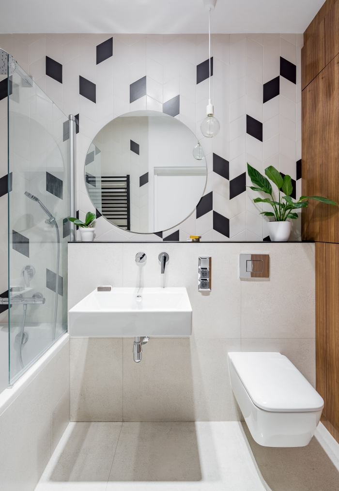 Phòng tắm hiện đại và sang trọng với điểm nhấn của bức tường và cây xanh.