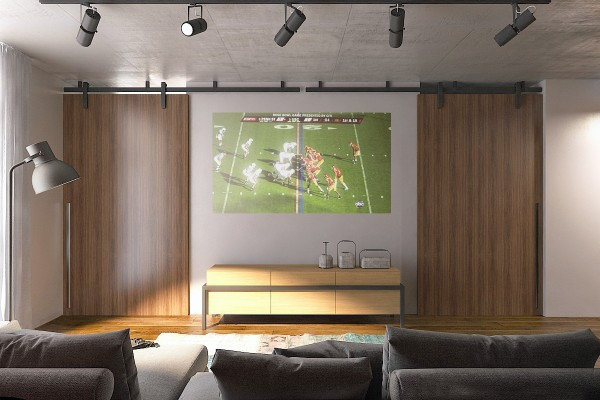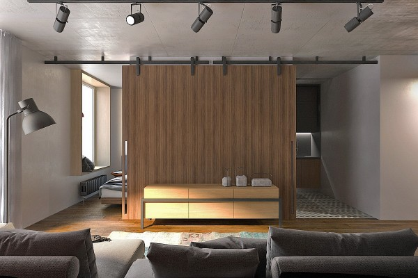 Tấm gỗ trượt có thể giấu tivi và ẩn bên trong là không gian phòng ngủ và nhà bếp. Đây là một thiết kế tuyệt vời để phân chia không gian sống trong các căn hộ studio.