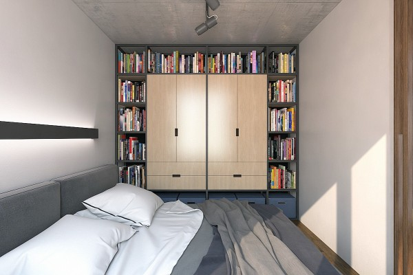 Phòng ngủ mặc dù khá nhỏ nhưng luôn thoáng đãng nhờ cửa kính và có rất nhiều không gian lưu trữ được bố trí trong bức tường ngăn cách.