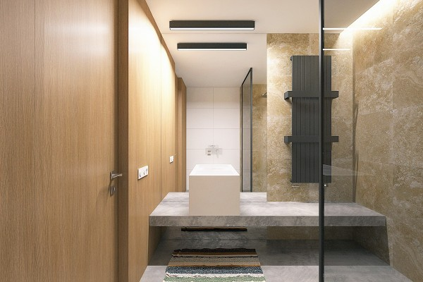 Không gian phòng tắm sang trọng, hiện đại. Một tấm thảm sọc với màu sắc tự nhiên giúp phòng tắm nổi bật so với phần còn lại của ngôi nhà.