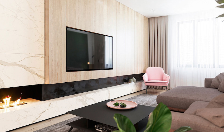 Vật liệu xây dựng bằng gỗ tự nhiên được sử dụng trong toàn bộ sàn gỗ, bức tường phía sau TV, sau ghế sofa mang đến bầu không khí ấm áp cho không gian.