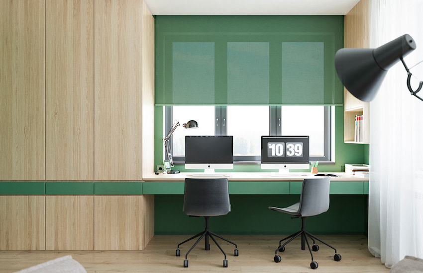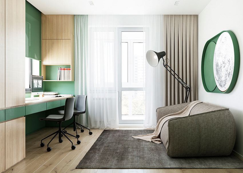 Cảm giác về sức sống của không gian, phần mở rộng màu xanh lá cây tươi mát được áp dụng cho tủ nghiên cứu và bức tường, và tông màu gỗ được kết hợp với một bầu không khí sảng khoái và thoải mái.