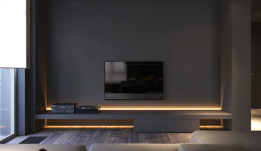 Căn hộ được sử dụng các vật liệu khác nhau, sàn gỗ ấm áp và gạch màu be để cân bằng độ sâu của màu đen và sử dụng ánh sáng từ đèn LED âm tường, đèn nhỏ, đèn chùm để tạo cảm giác ấm cúng, gần gũi.