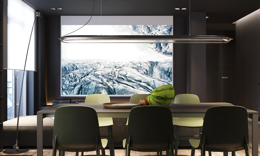 Ngoài TV treo tường trong phòng khách, máy chiếu cũng được thêm vào cùng thiết kế rèm cửa có thể được kéo xuống khi cần tạo một rạp chiếu phim nhỏ tại nhà thú vị.