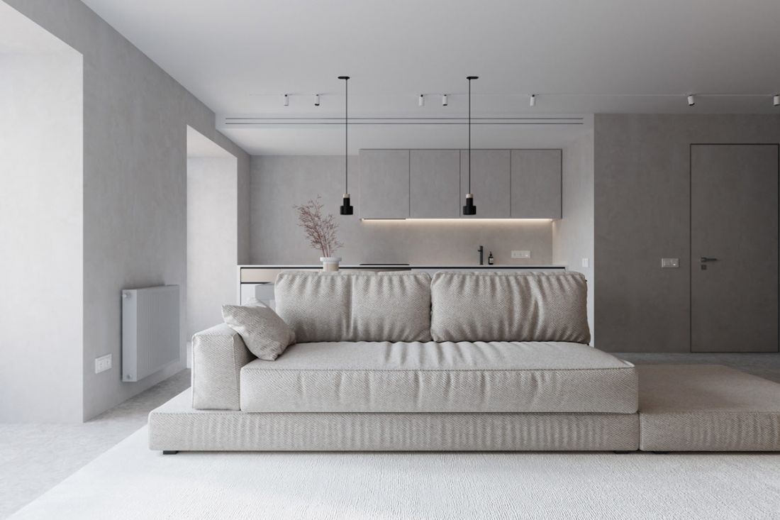 Chiếc ghế sofa nhạt được đặt hướng quay lại với không gian bếp, đây là chủ ý của gia chủ nhằm tối ưu hóa không gian.