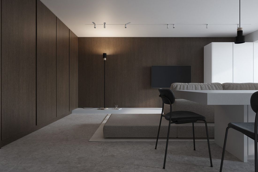 Hai bức tường gỗ sẫm màu được xếp hình chữ L sẽ là điểm nhấn ấn tượng trong không gian màu trắng. Đồng thời nó cũng là bức tường ngăn cách các không gian trong căn nhà.