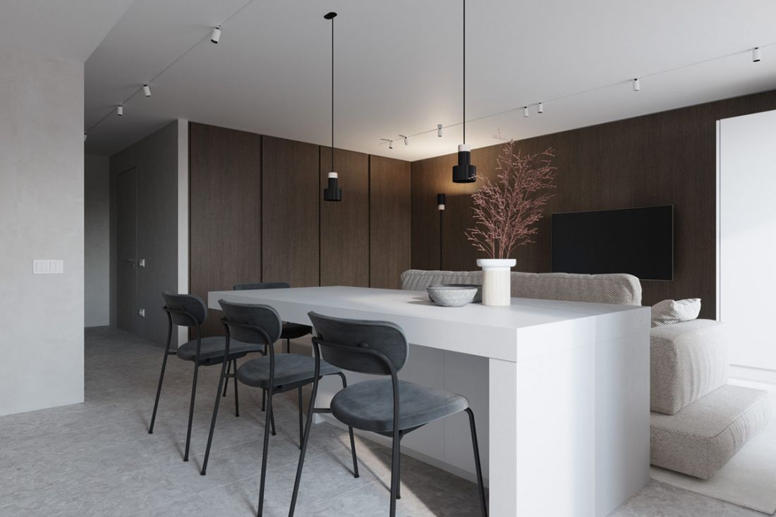 Những chiếc ghế ăn đối lập màu sắc với chiếc bàn hình chữ nhật trắng. Từ đây vừa ăn vừa có thể xem được ti vi, một sự sắp xếp rất tiện ích.