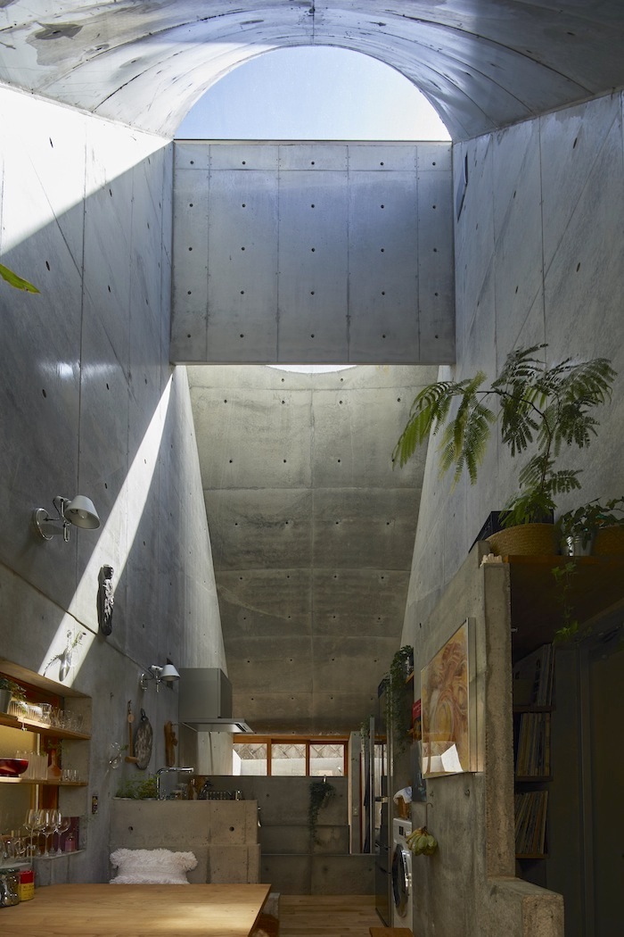 Tông màu trung tính tạo cảm giác mát lạnh trên tường và trần, giếng trời mở trên mái nhà để giải quyết vấn đề ánh sáng ban ngày.