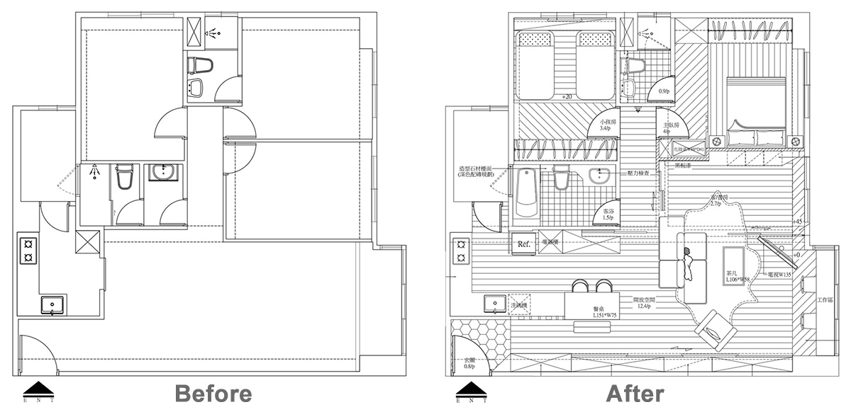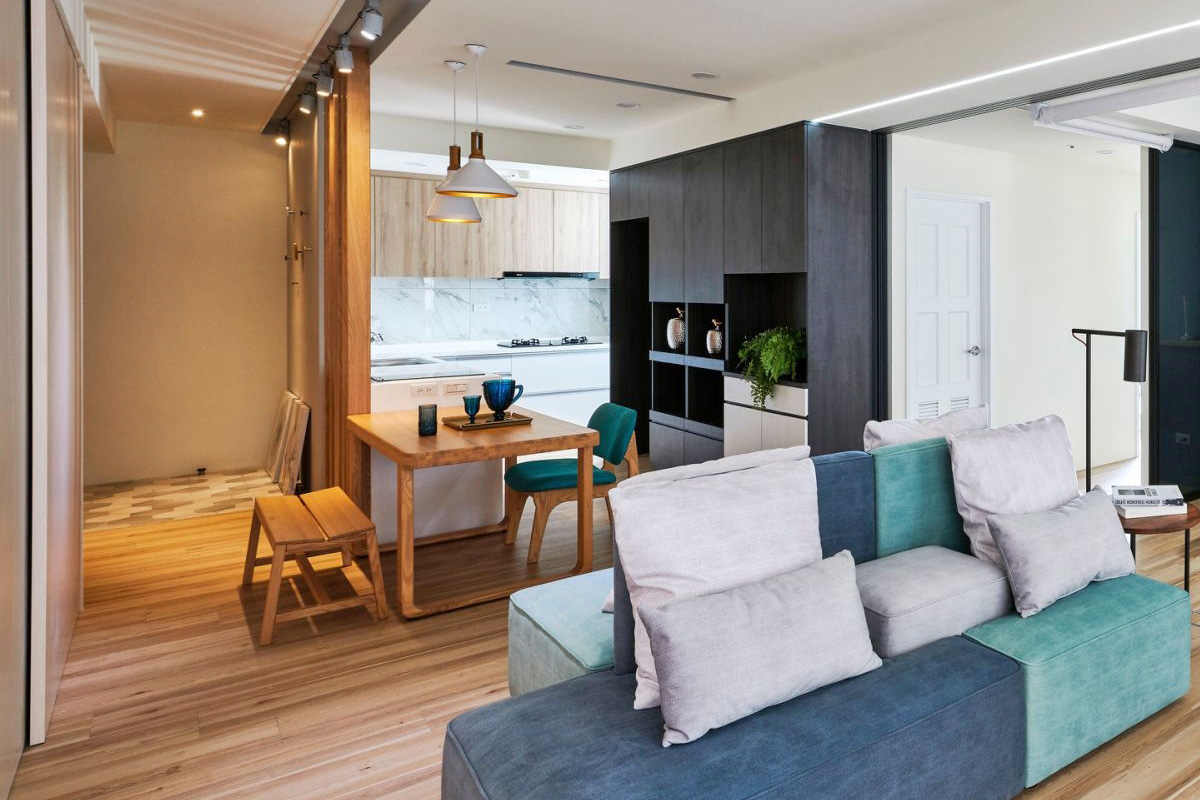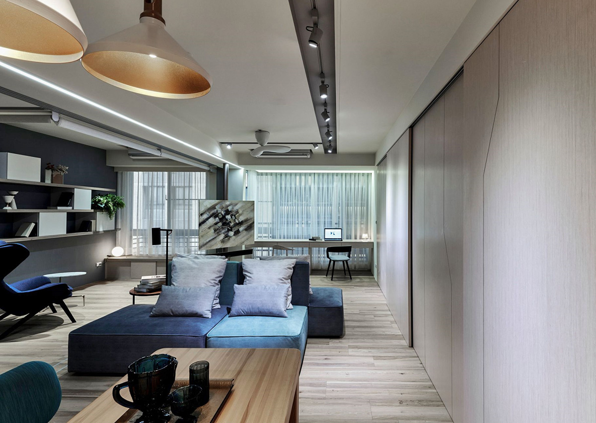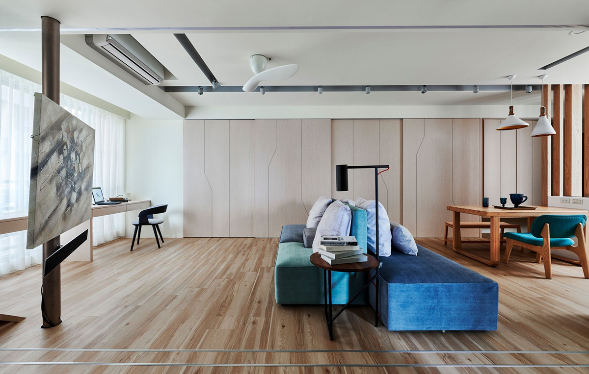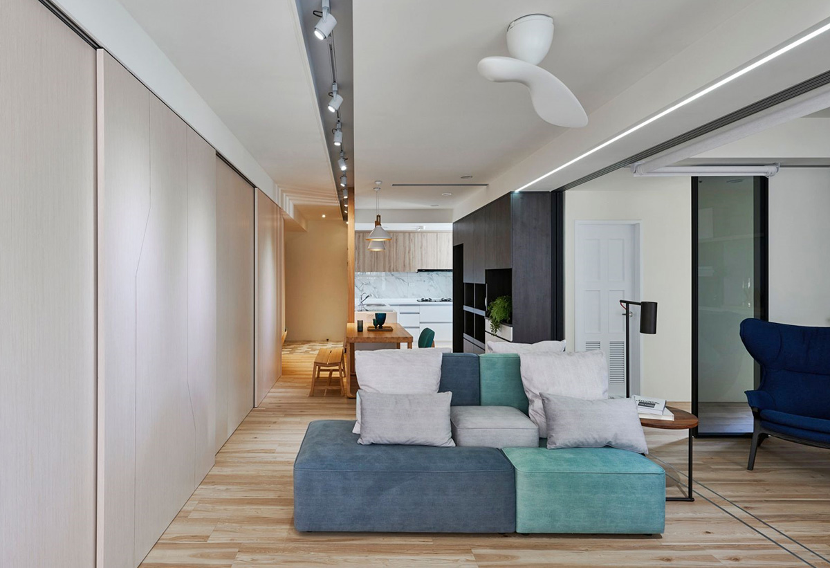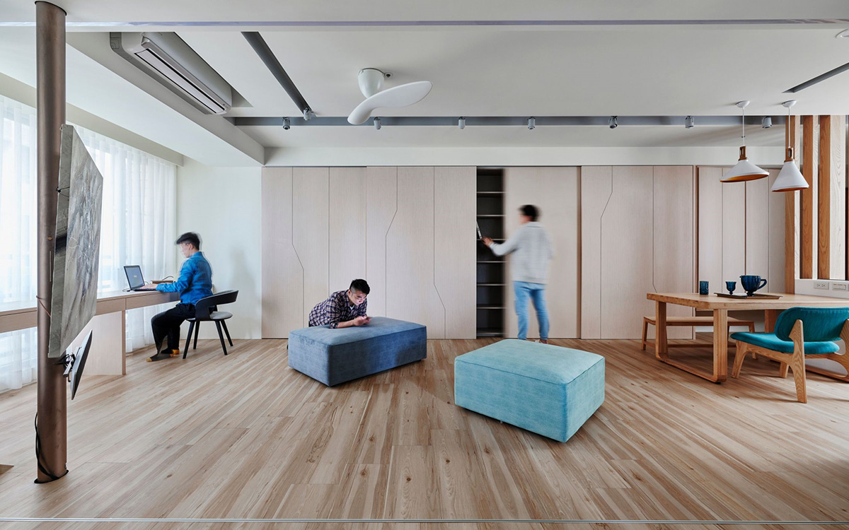 Dựa vào phía sau là tủ hệ thống do chủ cũ để lại. Sau khi được đội ngũ thiết kế tân trang lại, nó được tạo hình thành một tủ phẳng với nhiều chức năng lưu trữ, bề mặt được phủ bằng gỗ sáng mềm. Ngoài ra, thông qua các đường rơi của cửa xuống trần nhà, dưới ánh đèn được sắp xếp trật tự, được trang trí với quạt trần tinh giản màu trắng tinh khiết.