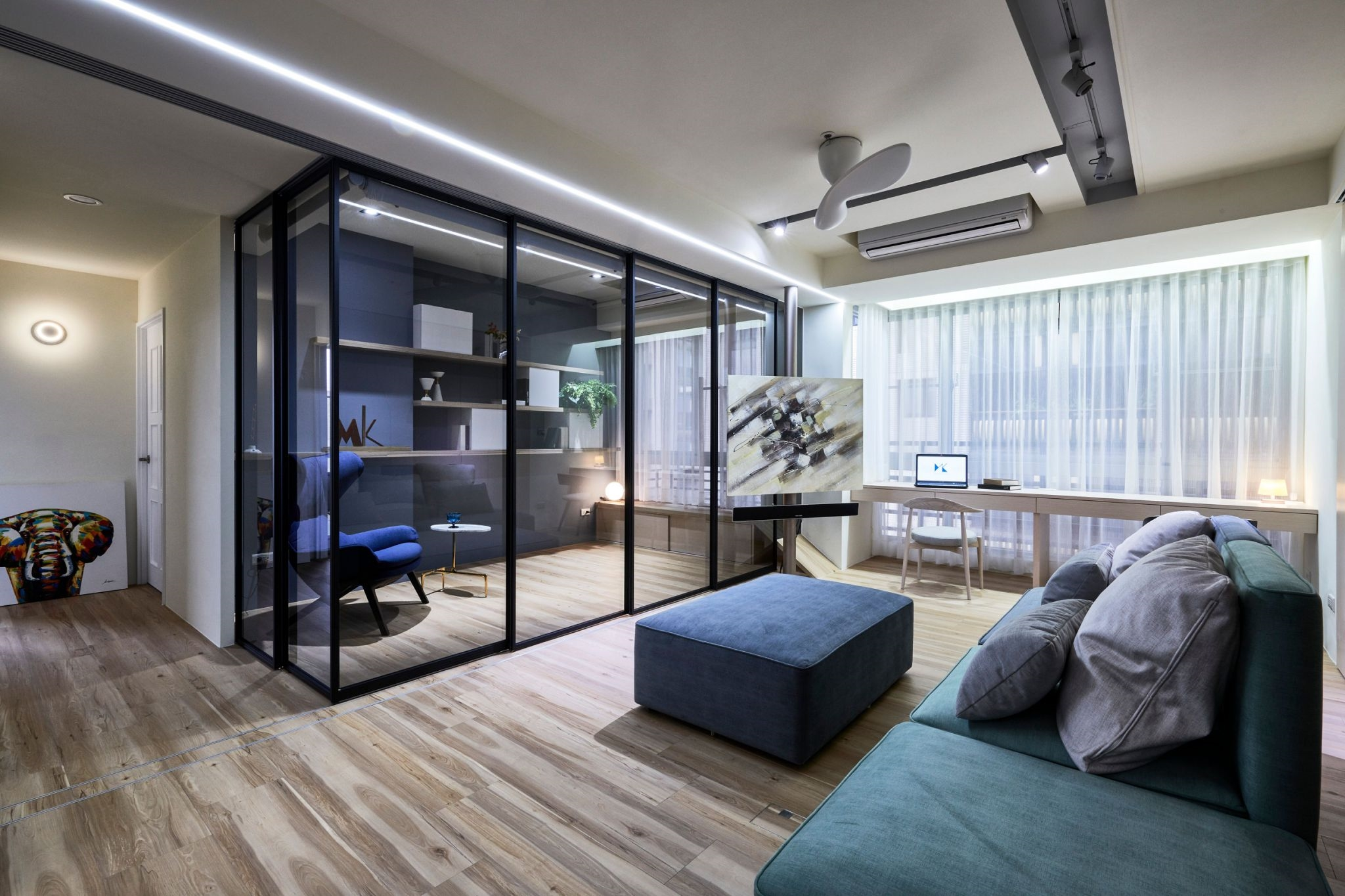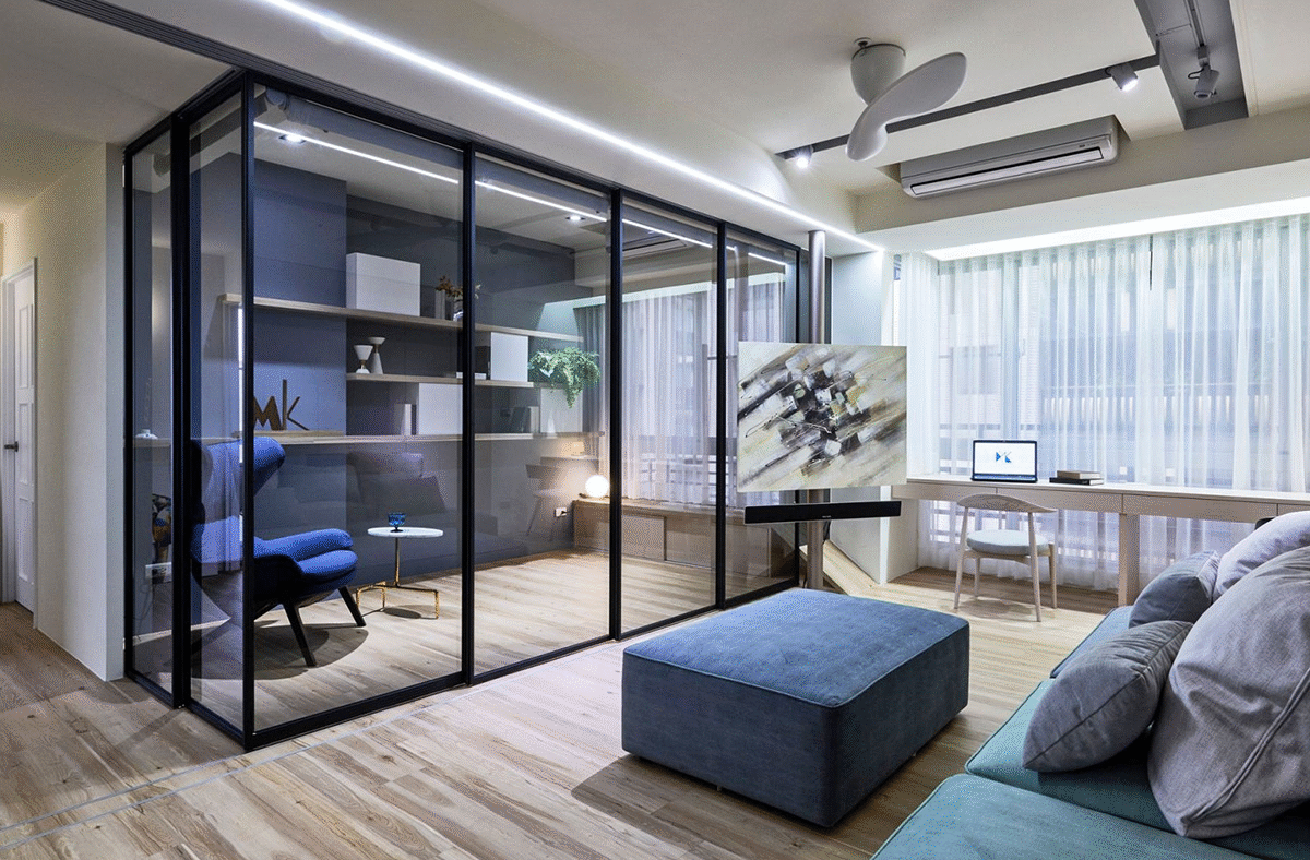 Phòng khách rất linh hoạt, cho phép chủ sở hữu chuyển sang hình chữ L hoặc hình vuông theo nhu cầu và loại bỏ tủ TV truyền thống, sử dụng khung TV treo có thể xoay 180 độ để điều chỉnh. Ngoài thể hiện trực quan, nó cũng thúc đẩy sự tương tác giữa cha mẹ và con cái.