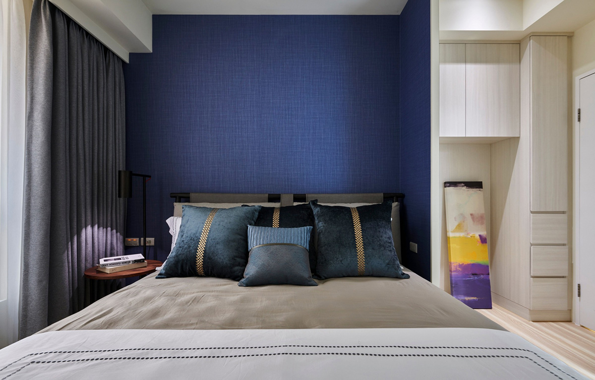 Để mở rộng chức năng của phòng ngủ chính, thiết kế xoay tường được thiết kế khéo léo tạo thành một rãnh giữa tường của phòng làm việc và phòng ngủ, bàn trang điểm được thiết kế đứng. Tông màu xanh đậm được sử dụng tạo ra không gian yên tĩnh và thư giãn.