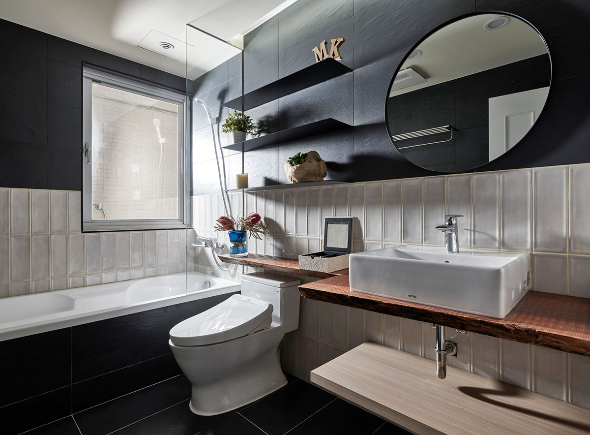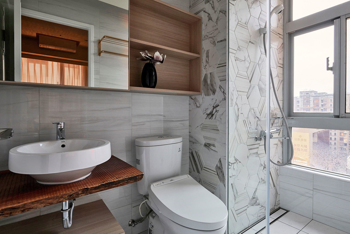 Chủ nhân mong muốn thiết kế phòng tắm theo các phong cách khác nhau. Do đó, phòng tắm sử dụng tông màu đơn giản của phong cách Bắc Âu với màu xám và trắng của gạch hình lục giác, tạo điểm nhấn thị giác.