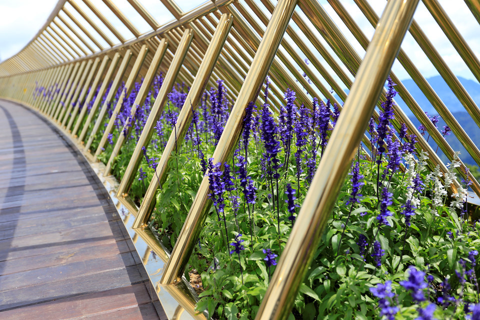 Lan can cầu được mạ vàng sang trọng cùng với điểm nhấn về màu sắc của cây cối, khiến cầu trở nên rực rỡ dưới ánh nắng mặt trời.