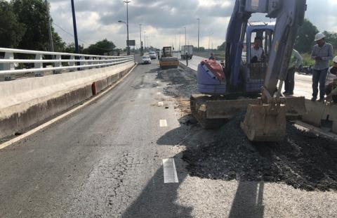 Đoạn sụt lún, trồi nhựa, gồ cao 20cm, kéo dài hơn 10m, nằm ở cả 2 làn ôtô ngay dốc lên cầu vượt Mỹ Thủy, theo hướng từ Quận 2 đi Quận 7 gây nguy hiểm cho các phương tiện tham gia giao thông. Vì thế ngay trong sáng 1/7, rất nhiều kỹ sư, công nhân cùng phương tiện, xe cơ giới… được tập kết ngay đầu cầu vượt trên đường Võ Chí Công để thi công khắc phục sự cố này.