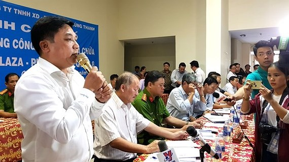 Lãnh đạo Công ty Hùng Thanh (chủ đầu tư chung cư Carina Plaza) trao đổi tiến độ khắc phục hư hỏng chung cư với cư dân
