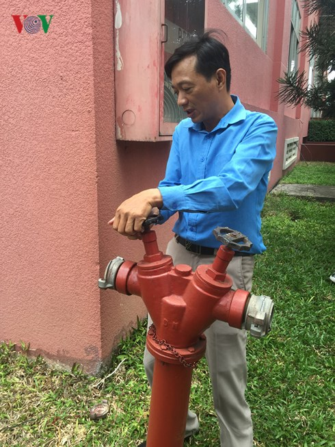 Ban quản lý chung cư An Lạc kiểm tra trụ nước PCCC.