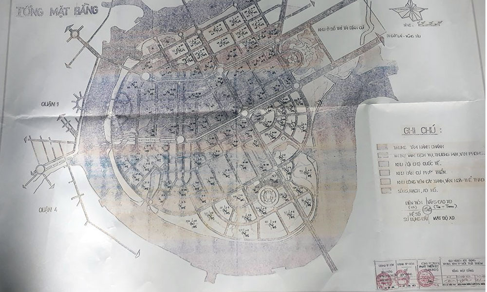 Để chứng minh điều này, ông Lung đã đưa tấm bản đồ này ra, trên bản đồ ghi cụ thể “Quy hoạch xây dựng Khu đô thị Thủ Thiêm – Tổng quy hoạch”, phía dưới ghi rõ các cơ quan chức năng đóng dấu xác nhận gồm: Sở Xây dựng và Công ty Dịch vụ phát triển đô thị với ký hiệu bản vẽ KT-06, ngày 12/6/1995, tỷ lệ 1/5000.