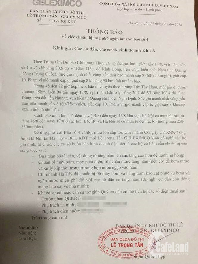 Để ứng phó với cơn bão số 4 và đợt mưa lớn sắp tới, chi nhánh Công ty cổ phần XNK Tổng hợp Hà Nội tại Hà Tây – BQL KĐT mới Lê Trọng Tấn Geleximco yêu cầu các hộ dân tại đây đưa toàn bộ tài sản, vật dụng từ tầng hầm lên các tầng cao để tránh hư hỏng. Đồng thời, đề nghị cư dân chuẩn bị máy bơm, máy phát điện, file chắn nước tầng hầm (nếu có) để bơm nước và xử lý kịp thời trong trường hợp nước ngập vào hầm...